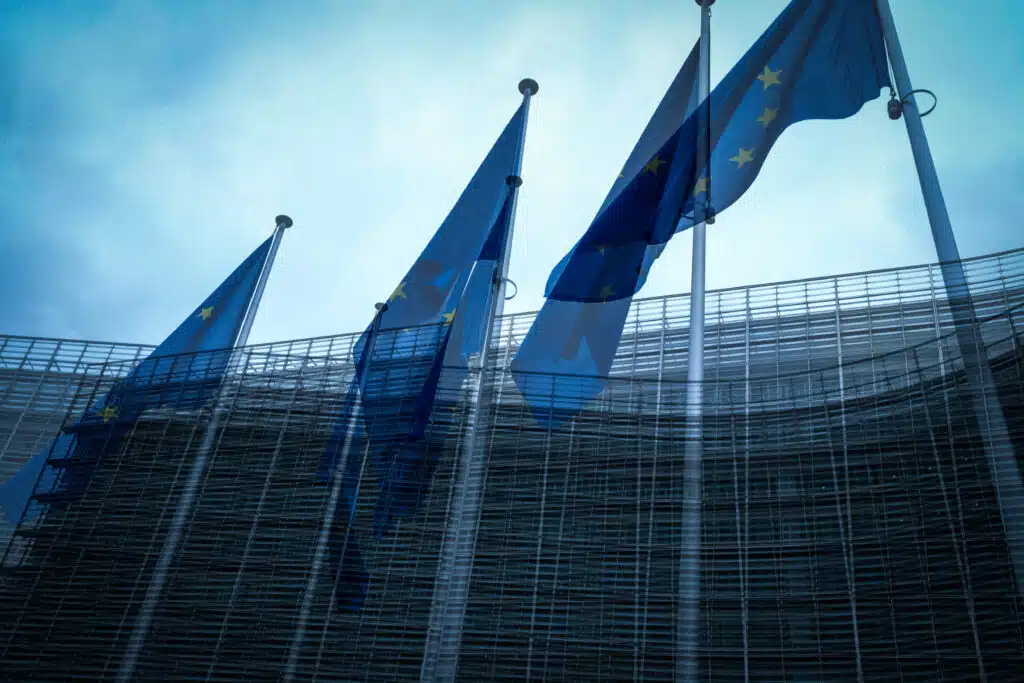 Building with flag during a press point by European Commissioner for Financial Services and the Savings and Investments Union Maria Luis Albuquerque on a proposal to shorten the settlement cycle for EU securities in the Berlaymont the headquarters of the European Commission an institution of the European Union in Brussels in Belgium on 12th february 2025. Batiment avec drapeau durant un point presse de la Commissaire europeenne aux Services financiers et a l Union de l epargne et des investissements Maria Luis Albuquerque sur une proposition visant a raccourcir le cycle de reglement pour les titres de l UE au Berlaymont le siege de la Commission Europeenne institution de l Union Europeenne a Bruxelles en Belgique le 12 fevrier 2025/