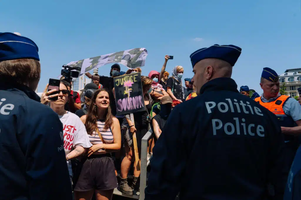 Police and counter-protestors pictured at a manifestation of police to support their colleague who was behind the steering wheel running over and killing Fabian (11), at the Brussels council chamber on Friday 13 June 2025. The 11-year-old Fabian died after he was was chased and hit by a police car, driving an electric scooter at the Elisabeth park in Ganshoren on June 2nd. BELGA PHOTO MARIUS BURGELMAN
