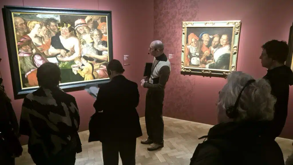 Cette veine se prolonge dans les Flandres, avec des scènes de groupes tapageuses comme la Compagnie joyeuse de Jan Massys, où des vieillards amoureux servent d'avertissement moral contre les plaisirs tardifs. Une section entière est consacrée aux fous et bouffons de cour, figures tragi-comiques au cœur de scènes carnavalesques où l'ordre social se renverse le temps d'une journée.