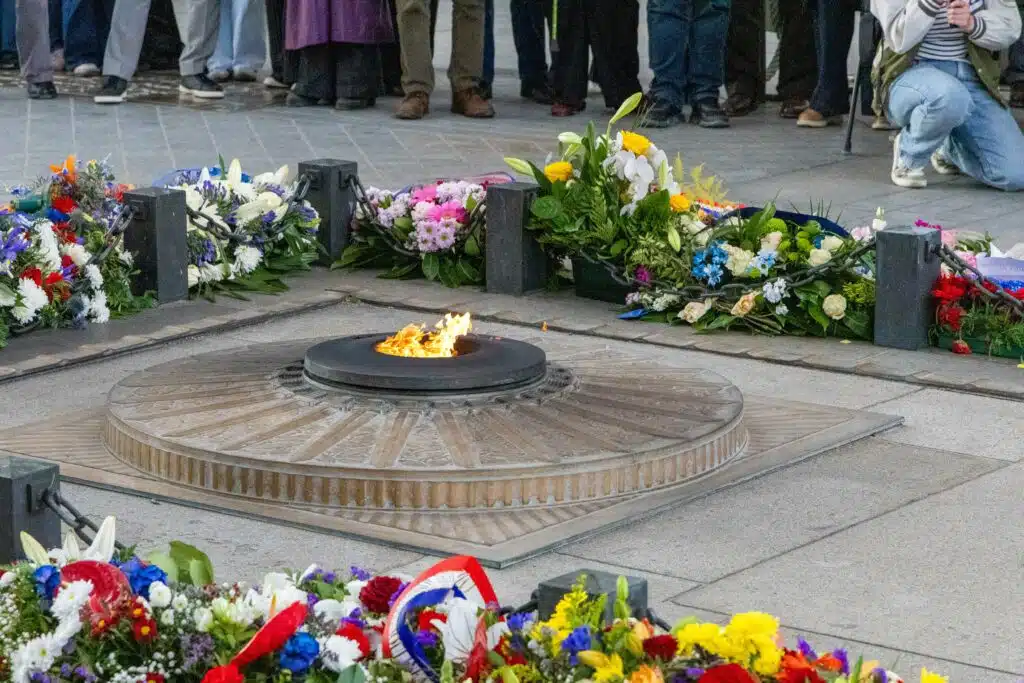 Flame of the Unknown Soldier after being rekindled on National Day of Remembrance for the Victims and Heroes of Deportation in Paris in France on April 27, 2025. Flamme du Soldat Inconnu apres son ravivage lors de la journee nationale du souvenir des victimes et des heros de la deportation a Paris en France le 27 avril 2025.