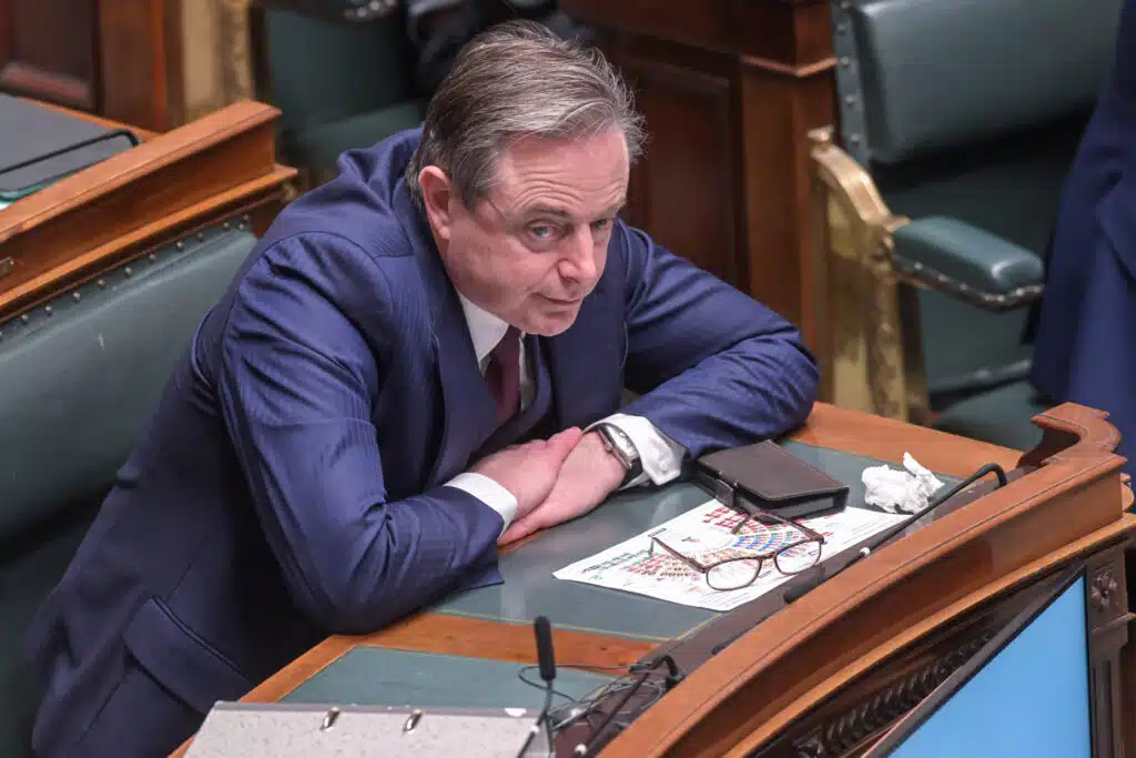 Prime Minister Bart De Wever is pictured during a plenary session of the chamber of the federal parliament in Brussels, Thursday 06 February 2025. On today's agenda: name vote on the possible motion of confidence tabled at the end of the government statement. Negotiators from the five parties that make up the Arizona coalition - the N-VA, MR, Engages, Vooruit and CD&V - reached a government agreement last Friday evening. BELGA PHOTO JONAS ROOSENS