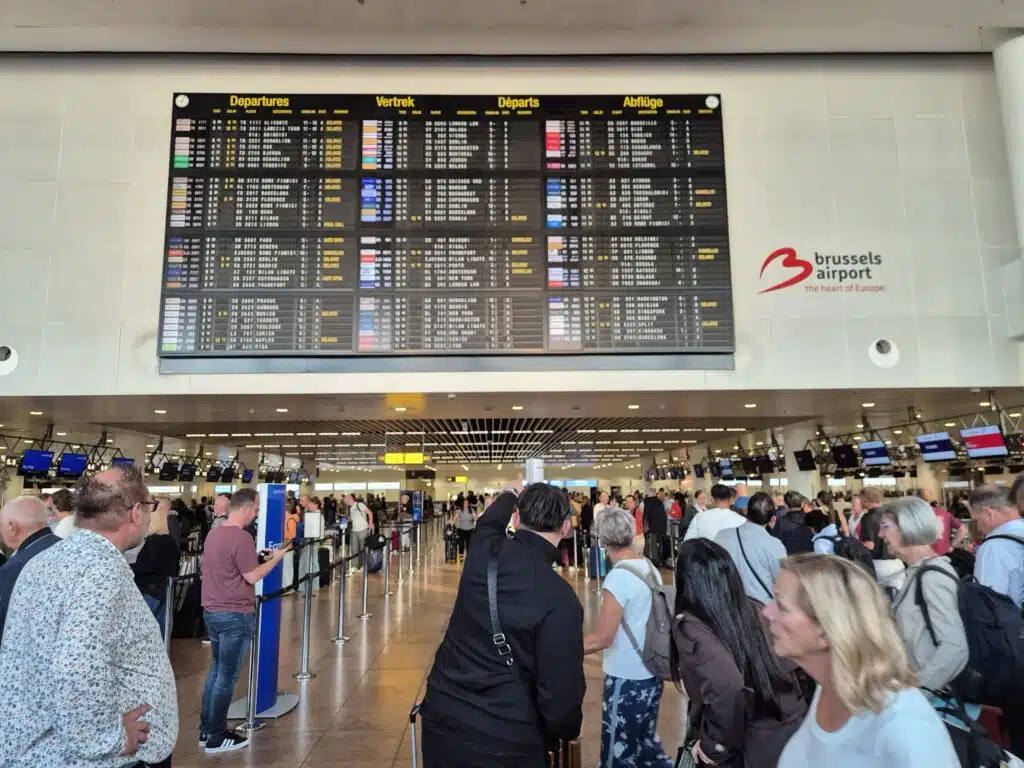 People pictured waiting at the check-in of Brussels Airport on Saturday, September 20, 2025 in Brussels. Brussels Airport was hit by a cyber attack which impacted its processes on Friday. The checkin was impacted by that, and on Saturday, most check-ins are processed manually. That has a huge impact on the waiting lines. BELGA VIDEO JORIS SMETS BELGA PHOTO JORIS SMETS