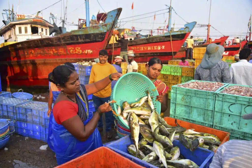 Workers and laborers form a human chain to unload crates of fresh fish from a large deep-sea trawler at the Mangalore Bunder, locally known as "Dhakke," in Mangalore. The Mangalore fishing harbor is the largest marine landing center in the state, contributing nearly 40% of Karnataka’s total marine catch. This hub is a critical driver of the regional economy, supporting the livelihoods of over 160,000 people and fueling a seafood export industry that serves global markets, including Japan, the Middle East, and Europe. - Shriram BN / SOPA Images//SOPAIMAGES_SOPA17076/Credit:Shriram BN / SOPA/SIPA/2512201431