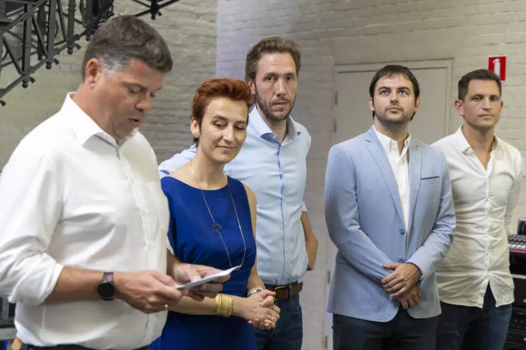 Open VLD's Tom Ongena, Open Vld candidate chairman Tineke Van hooland, Open Vld candidate chairman Frederic De Gucht, Open Vld candidate chairman Stefaan Nuytten and Open Vld candidate chairman Maurits Vande Reyde pictured during the announcement of the results of the chairman elections of Flemish liberal party Open Vld, in Brussels, Saturday 17 August 2024. If no candidate wins more than 50 percent of the votes, a second round is organised between the two best scoring candidates. BELGA PHOTO NICOLAS MAETERLINCK