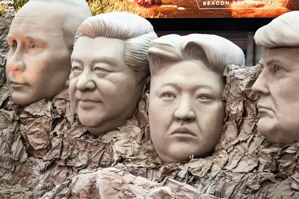 (Photo Chanakarn Laosarakham / AFP : un "Mont Rushmore" réinventé avec Poutine, Xi Jinping, Kim Jong Un, Donald Trump, lors d'un "Summit Camp" à Bangkok, Thaïlande, 24 septembre 2025)