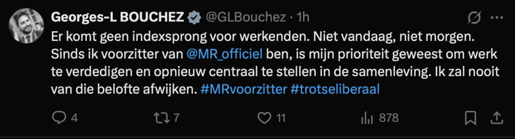 Encore plus tranchant, Sammy Mahdi (CD&V) juge l’option « onbespreekbaar » : « Un saut d’index, c’est pénaliser les travailleurs au profit des grandes entreprises, pour un rendement budgétaire quasi nul à court terme », a-t-il déclaré à Belga. Le CD&V revendique avoir fait de la protection de la classe moyenne laborieuse une ligne rouge lors des négociations gouvernementales. Quant à Georges-Louis Bouchez, il vient également de se déclarer sur « X » contre cette mesure.