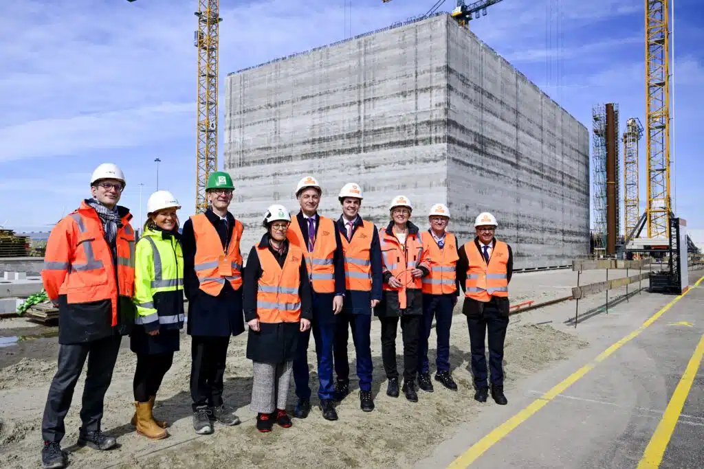 Elia CEO Transmission Belgium Frederic Dunon, Jan De Nul Dredging CEO Julie De Nul, DEME CEO Luc Vandenbulcke, Energy minister Tinne Van der Straeten, Prime Minister Alexander De Croo, State Secretary for scientific policy Thomas Dermine, Elia CEO ad-interim Catherine Vandenborre, , North Sea Port CEO Daan Schalck and Lineas Executive Chairman Bernard Gustin pictured during a visit to the construction site of the 'Prinses Elisabeth Eiland - Ile Princesse Elisabeth' energy island in the North Sea in Vlissingen, the Netherlands on Tuesday 23 April 2024. The island will form a link between the offshore wind parks and the mainland electricity network. BELGA PHOTO DIRK WAEM