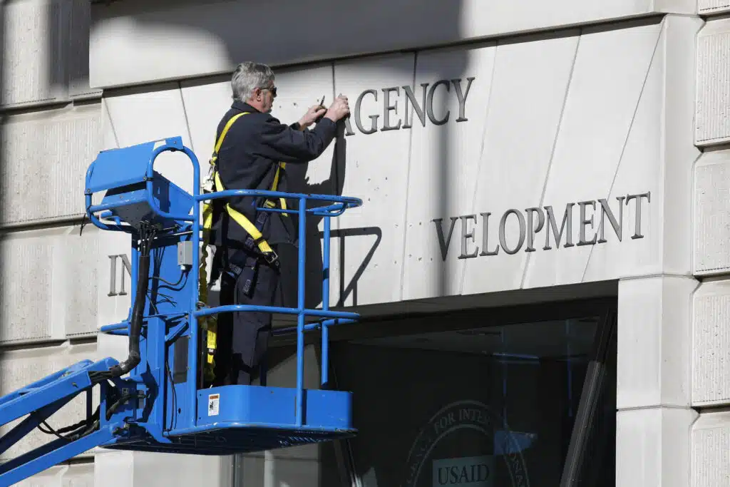 February 7, 2025, Washington, District of Columbia, USA: A worker removes the signage outside the United States Agency for International Aid (USAID) building after President Trump and Musk called for it to be shuttered, spurring outcry from Democrats in Congress. (Credit Image: © Mark Alfred/ZUMA Press Wire)