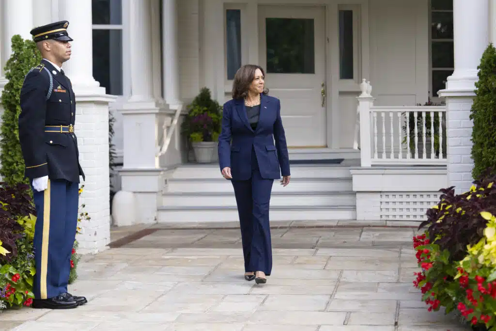 US Vice President Kamala Harris arrives to welcome South African President Cyril Ramaphosa to her residence at the US Naval Observatory in Washington, DC, on September 16, 2022. (Photo by Jim WATSON / AFP)