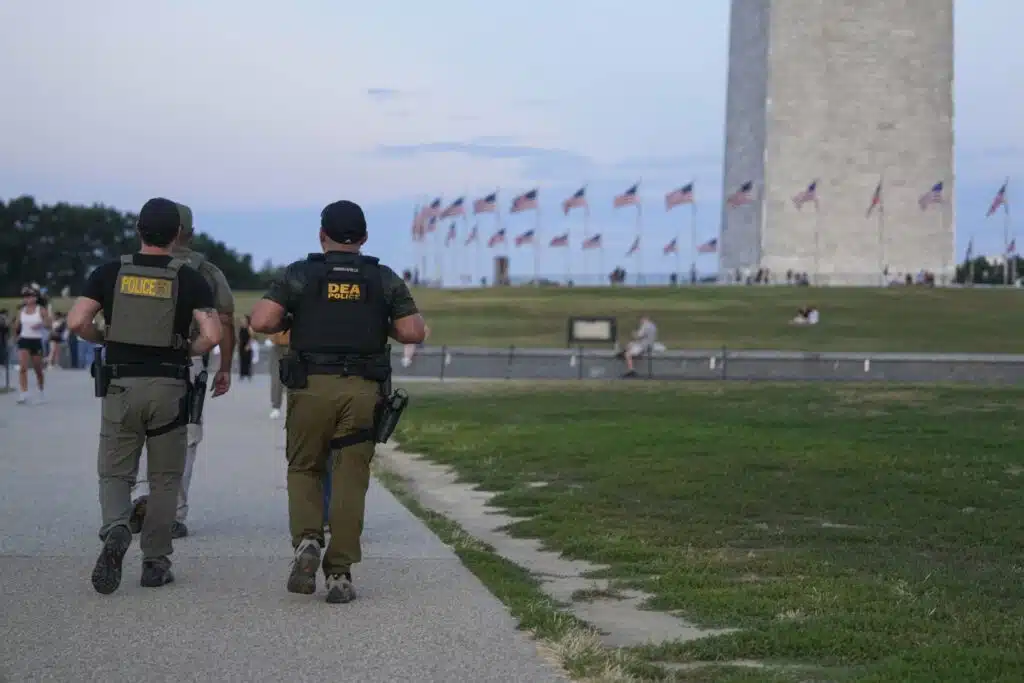 WASHINGTON, DC - AUGUST 8: Drug Enforcement Administration (DEA) personnel walk along the National Mall on August 8, 2025 in Washington, DC. The Trump administration has initiated a federal takeover of DC police and mobilized the DC National Guard, saying the moves are necessary to restore order in the city. City officials say they did not know about the plans in advance. Kayla Bartkowski/Getty Images/AFP Kayla Bartkowski / GETTY IMAGES NORTH AMERICA / Getty Images via AFP