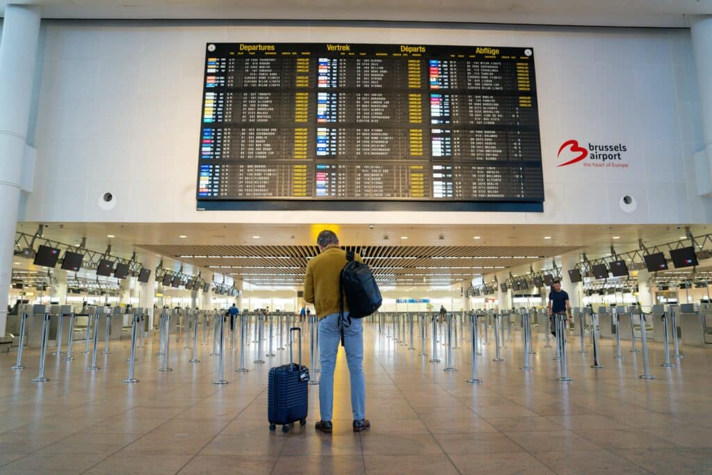 (Photo Belga Marius Burgelman : un passager dans le hall des départs de Brussels Airport, en ce jour de grève du 14 octobre 2025)
