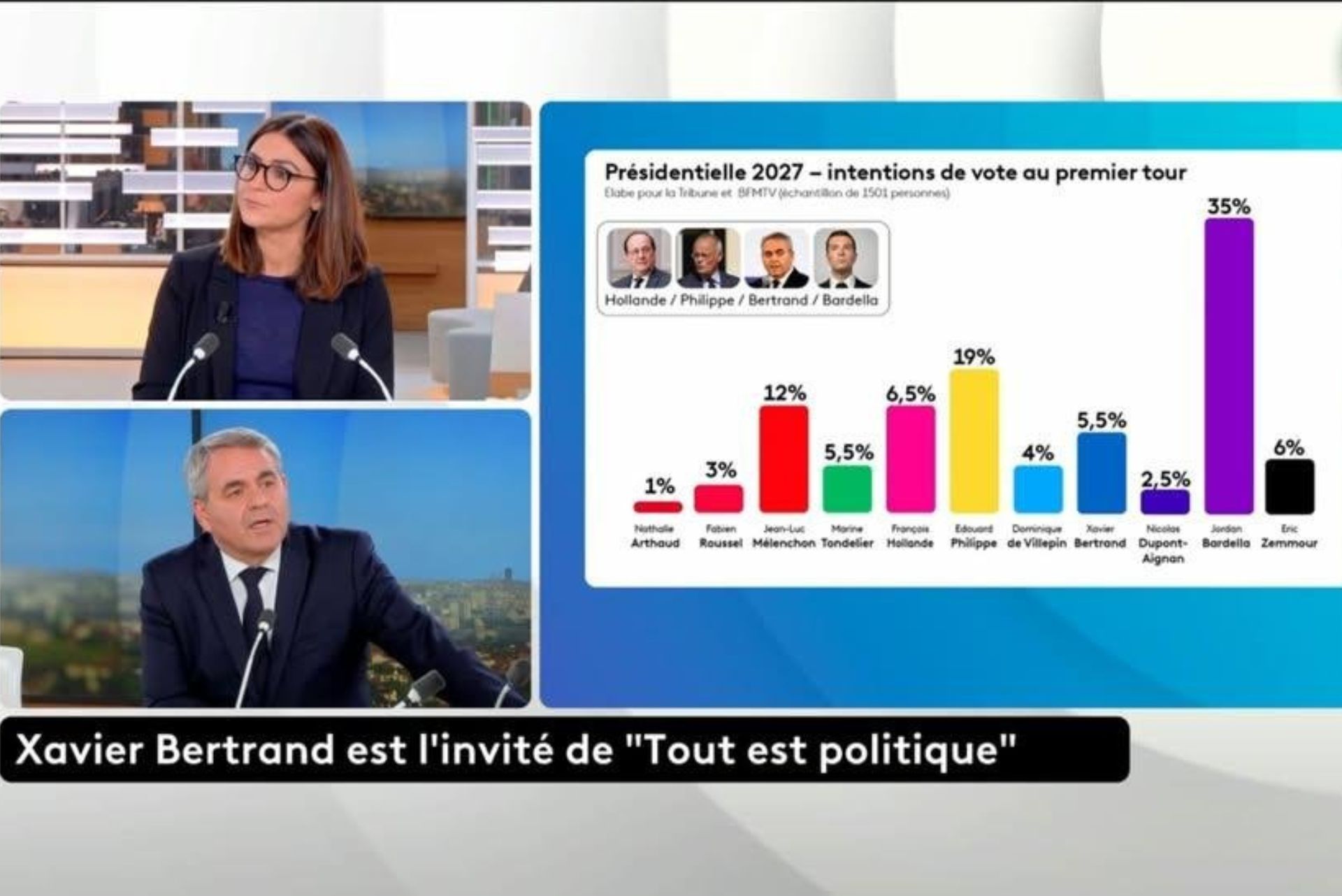 Lundi soir, dans l’émission « Tout est politique » animée par Sonia Chironi, un graphique présenté à l’antenne par Franceinfo a déclenché une vive polémique sur les réseaux : les barres colorées censées refléter les résultats d’un sondage d’Elabe pour « La Tribune Dimanche» et BFMTV ne correspondaient pas aux chiffres annoncés.