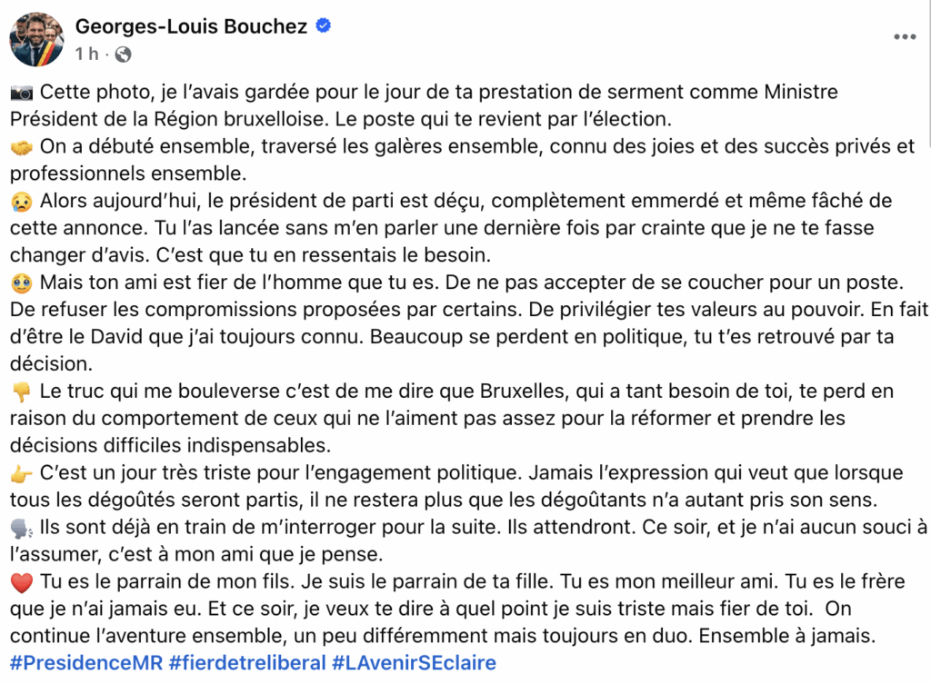 Dans un long post publié sur le réseau social Facebook, M. Bouchez a salué le travail de son « ami », s’estimant « fier » que ce dernier « privilégie ses valeurs au pouvoir ».