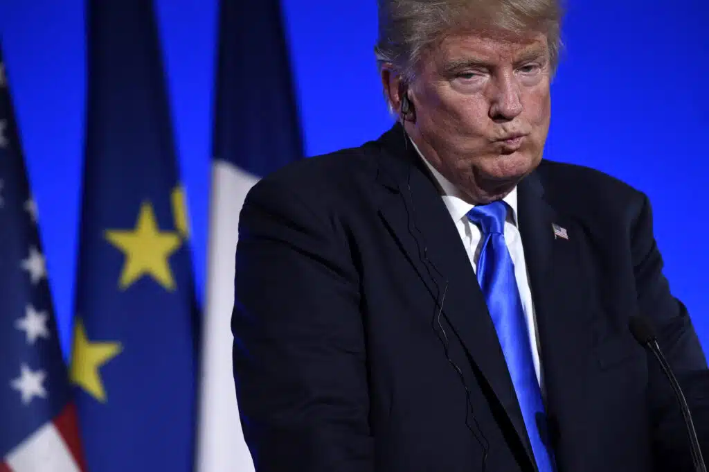 US President Donald Trump reacts during a press conference with the French President following meetings at the Elysee Palace in Paris, on July 13, 2017, during the US president's 24-hour trip that coincides with France's national day and the 100th anniversary of US involvement in World War I. Donald Trump arrived in Paris for a presidential visit filled with Bastille Day pomp and which the White House hopes will offer respite from rolling scandal backing home. (Photo by SAUL LOEB / AFP)