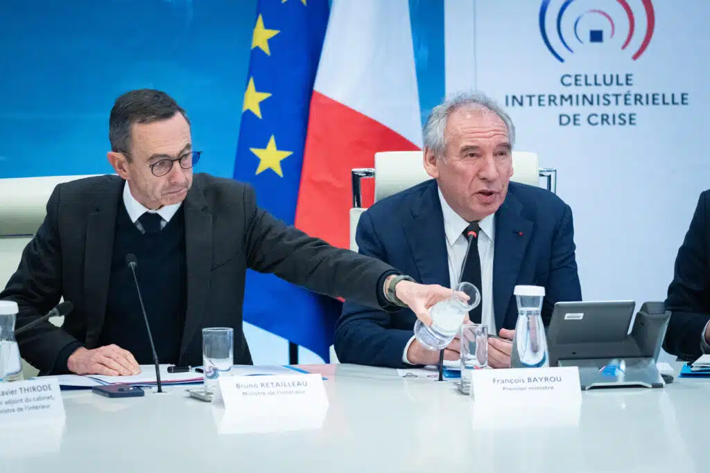 (Photo : le Premier ministre François Bayrou (à droite) en compagnie du ministre de l'Intérieur Bruno Retailleau au Centre interministériel de crise - 23 décembre 2024 - Belgaimage)