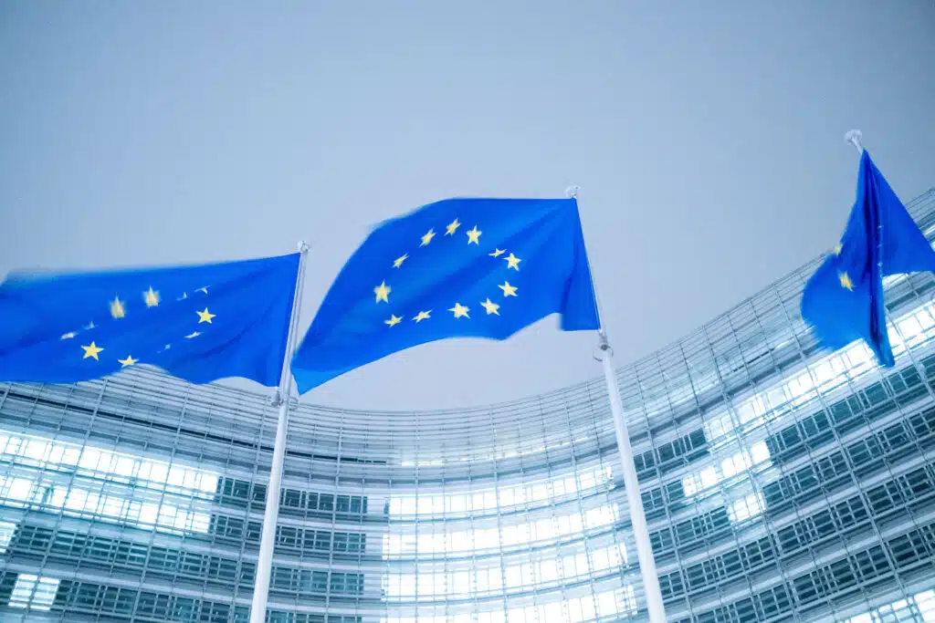 Building with flag during the press conference by President URSULA VON DER LEYEN and Vice-President for Prosperity and Industrial Strategy and for Industry and SME and the Single Market Stephane Sejourne on the EU Competitiveness Compass in the Berlaymont the headquarters of the European Commission an institution of the European Union in Brussels in Belgium on 29th of January 2025. The Commission presents the competitiveness compass for Europe to become the place where clean technologies ad services and products are invented and while being the first continent to become climate neutral in based on the Draghi report. (Photo by Martin Bertrand / Hans Lucas / Hans Lucas via AFP)