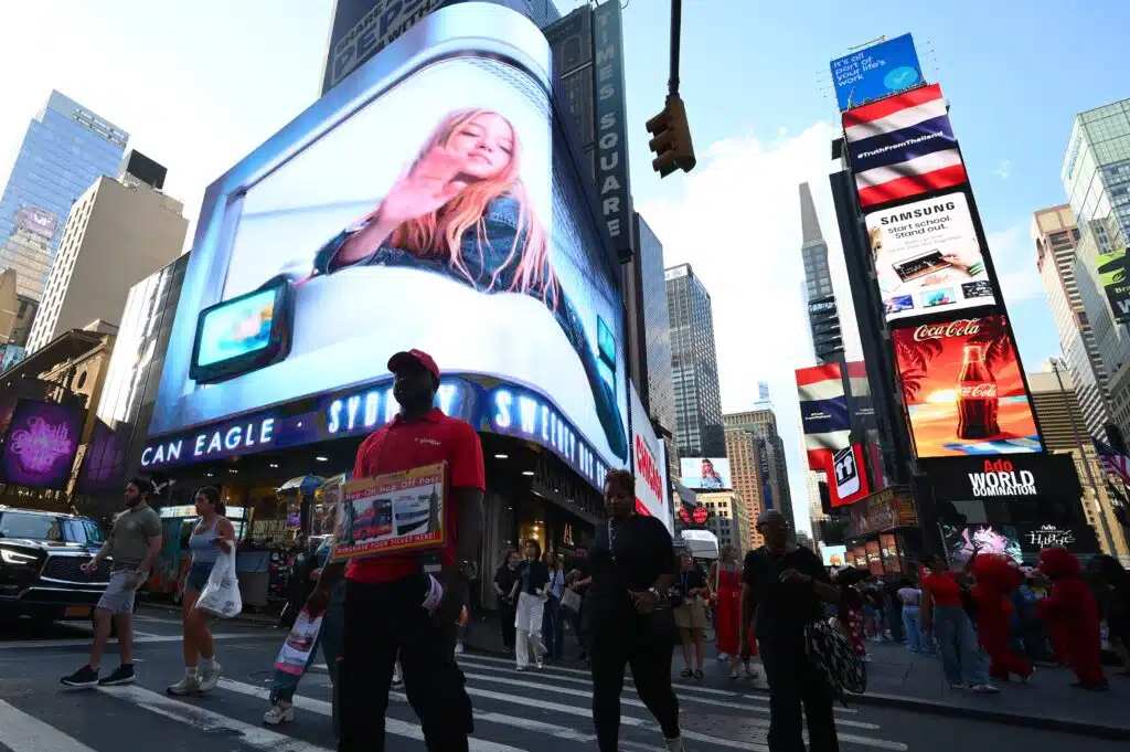 (Photo Anthony Behar/Sipa USA : publicité pour les jeans American Eagle avec Sydney Sweeney sur Times Square)