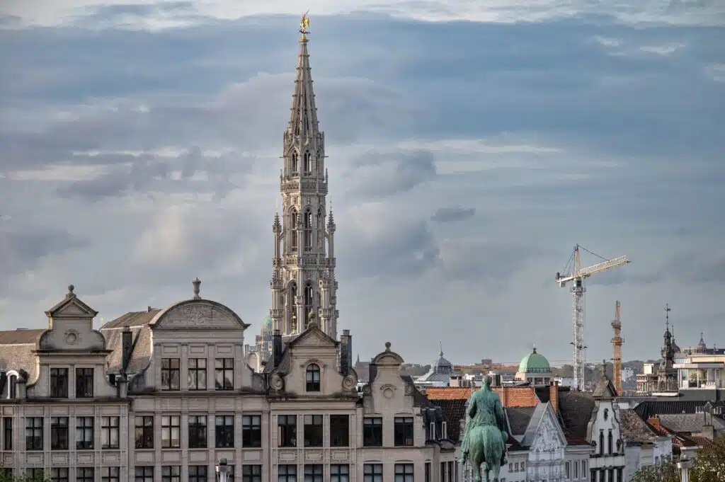A wide city view of central Brussels from a high vantage point, capturing the characteristic skyline of the city and the Gothic tower of Brussels City Hall (Hôtel de Ville de Bruxelles) on the Grand-Place. The image highlights historic rooftops, urban density, and the architectural heritage of Brussels, offering a comprehensive perspective of the city center.