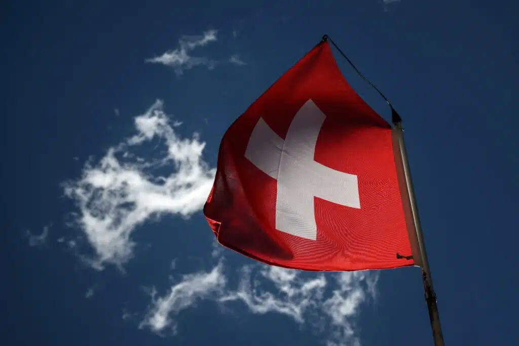 A Swiss national flag flutters in a blue sky in Bourg-Saint-Pierre, western Switzerland on June 21, 2022. Fabrice COFFRINI / AFP