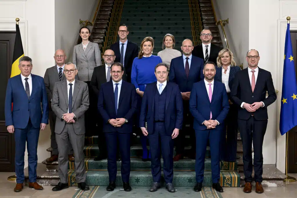 1st row l-r, Vice-prime minister and Minister of Finance, Combating Tax Fraud, Pensions, National Lottery and Cultural Institutions Jan Jambon, Vice-prime minister and minister and minister of Public Health and Social Affairs Frank Vandenbroucke, Vice-prime Minister and minister of Economy and Work David Clarinval, Prime Minister Bart De Wever, Vice-prime minister and Minister of Foreign Affairs Maxime Prevot, Vice-prime minister and Budget Minister Vincent Van Peteghem, 2d row l-r, Minister of Climate and Mobility Jean-Luc Crucke, Minister of Interior Bernard Quintin, Minister of Justice Annelies Verlinden, Minister of Defence and Foreign Trade Theo Francken, Minister of Public Modernisation Vanessa Matz, 3d row l-r, Minister of Middle Classes Eleonore Simonet, Minister for Consumer Protection, Social Fraud and Equal Opportunities Rob Beenders, Minister of Asylum and Migration, Social Integration and Major Cities Anneleen Van Bossuyt and Minister of Energy Mathieu Bihet pose for the official family portrait at the federal parliament, in Brussels, Tuesday 04 February 2025. Negotiators from the five parties that make up the Arizona coalition - the N-VA, MR, Engages, Vooruit and CD&V - reached a government agreement last Friday evening. BELGA PHOTO DIRK WAEM