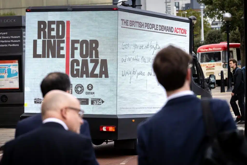 EDITORIAL USE ONLY A digital advertising van displaying Oxfam's 'Inaction Isn't Working' campaign, along with handwritten messages from the British public, travels around Liverpool on the first day of the Labour Party Conference, as the charity calls for action to be taken to stop the war in Gaza. Picture date: Sunday September 28, 2025.