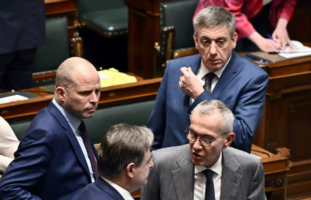 Minister of Defence and Foreign Trade Theo Francken, Prime Minister Bart De Wever, Vice-prime minister and minister and minister of Public Health and Social Affairs Frank Vandenbroucke and Vice-prime minister and Minister of Finance, Combating Tax Fraud, Pensions, National Lottery and Cultural Institutions Jan Jambon pictured during a plenary session of the chamber with the political declaration of the Belgian Prime Minister at the federal parliament, in Brussels, Tuesday 04 February 2025. Negotiators from the five parties that make up the Arizona coalition - the N-VA, MR, Engages, Vooruit and CD&V - reached a government agreement last Friday evening. BELGA PHOTO ERIC LALMAND