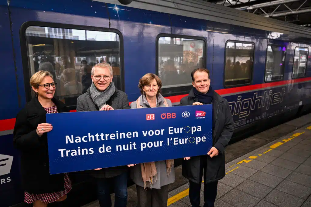 DB Fernverkehr Marketing director Sophie Buyse, Vice-prime minister and Mobility Minister Georges Gilkinet, NMBS - SNCB CEO Sophie Dutordoir and Executive Board Member OBB PV Klaus Garstenauer pose for the photographer at the official welcome of the first Nightjet night train from Berlin, at the Brussels-Midi (Brussel-Zuid - Bruxelles-Midi) train station, in Anderlecht, Brussels, Tuesday 12 December 2023. The journey from Berlin to Brussels/Paris is the inauguration journey of the new line. Normal passenger transport will start from December 12 from Brussels and December 13 from Berlin. The new Nightjet connections from Berlin to Brussels and Paris represent another important step in the expansion of night trains in Europe. BELGA PHOTO LAURIE DIEFFEMBACQ