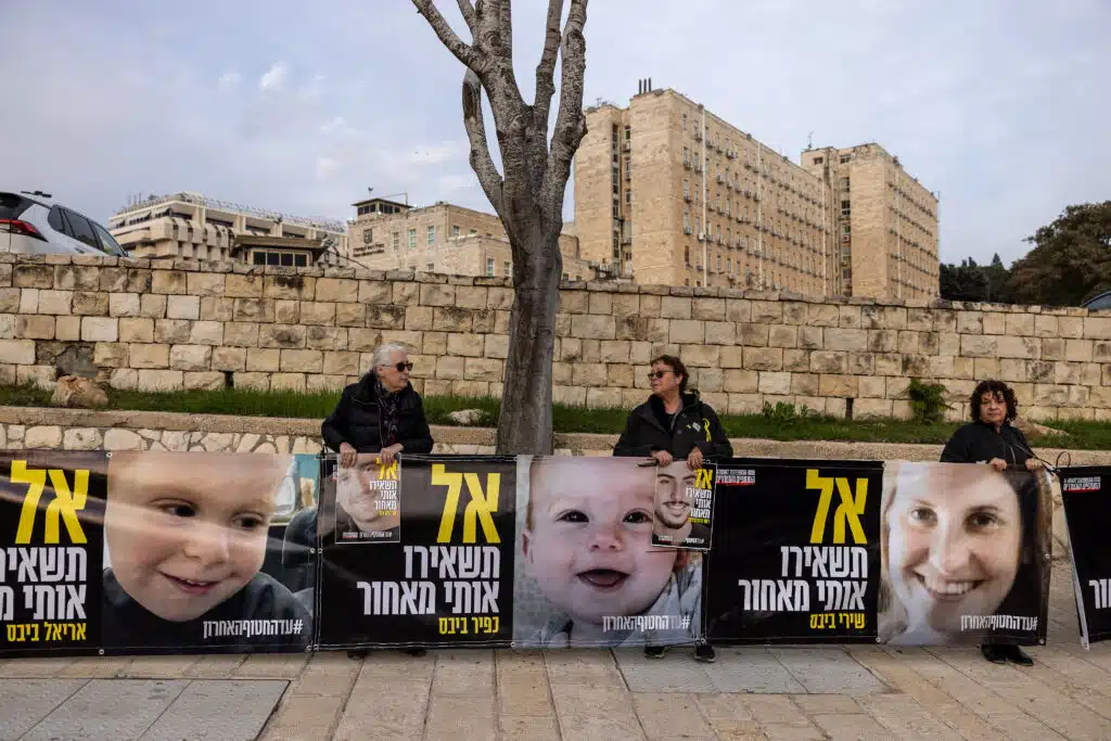 Supporters and relatives of Israeli hostages held captive in the Gaza Strip since the October 7, 2023 attacks by Palestinian militants hold images of the Bibas family as they protest in front of the prime minister's office in Jerusalem on February 3, 2025, calling to complete the deal with Hamas and to bring all hostages back. Israeli Prime Minister Benjamin Netanyahu will begin talks on a second phase to the Gaza ceasefire in Washington on February 3, his office said hours after the completion of the fourth hostage-prisoner exchange of the truce. (Photo by Menahem Kahana / AFP)