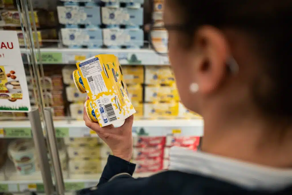A woman checks the approval number and expiration date of yoghurts produced by the PUR PERCHE brand in an Intermarche store in Remalard Orne France on April 10, 2025. Une femme verifie le numero d agrement et la date de peremption des yaourts produits par la marque PUR PERCHE dans un magasin INTERMARCHE a Remalard dans le departement de l Orne en France le 10 avril 2025.