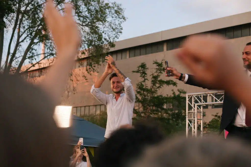 Raphael Arnault clapping on stage during a public rally in Avignon Vaucluse France on July 5, 2024. The rally took place in the context of the French legislative elections campaign with activists applauding and displaying banners and flags in a political mobilization context. Raphael Arnault applaudissant sur une scene lors d un rassemblement public a Avignon dans le Vaucluse en France le 5 juillet 2024. Le rassemblement se deroule dans le cadre de la campagne des elections legislatives francaises avec des militants applaudissant et affichant des banderoles et des drapeaux dans un contexte de mobilisation politique. Florence Demeusy / Hans Lucas / Hans Lucas via AFP
