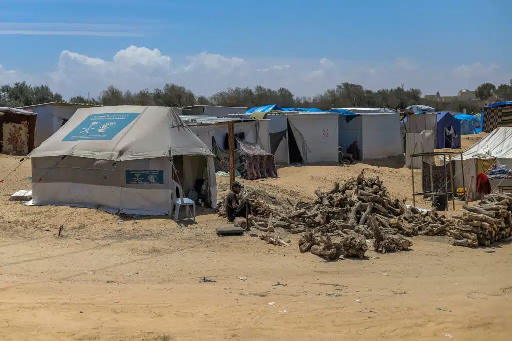 View of the recently set up displaement camp for the Palestinians arriving from Rafah in Khan Yunis camp in Gaza on May 12, 2024. Nearly 450,000 people have been displaced from Rafah since May 6, according to the United Nations Relief and Works Agency for Palestine Refugees in the Near East (UNRWA). Hundreds of people have left their homes carrying essential belongings with them to the displacement camps set up in Khan Yunis ahead of a wide military operation by Israel on Rafah town in Gaza, despite the growing pressure on Prime Minister Benjamin Netanyahu’s government to accept the proposed truce with Hamas and start a ceasefire. However, the Israeli war cabinet has persisted in going ahead with the operation in Rafah. The United Nations and humanitarian agencies have warned that the operation will lead to a humanitarian catastrophe in the already devastated areas in the Gaza Strip. Photo by Khames Alrefi/Middle East Images/ABACAPRESS.COM