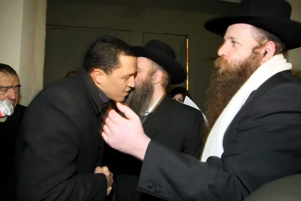 ©PHOTOPQR/LE PARISIEN/guy Gios ST DENIS LE 12/01/2009 RASSEMBLEMENT DEVANT LA SYNAGOGUE DE ST DENIS VISEE PAR DES COCKTAILS MOLOTOV LA NUIT DERNIERE. L IMAN HASSEM CHALGHOUMI EMBRASSE LE RABIN DE ST DENIS
