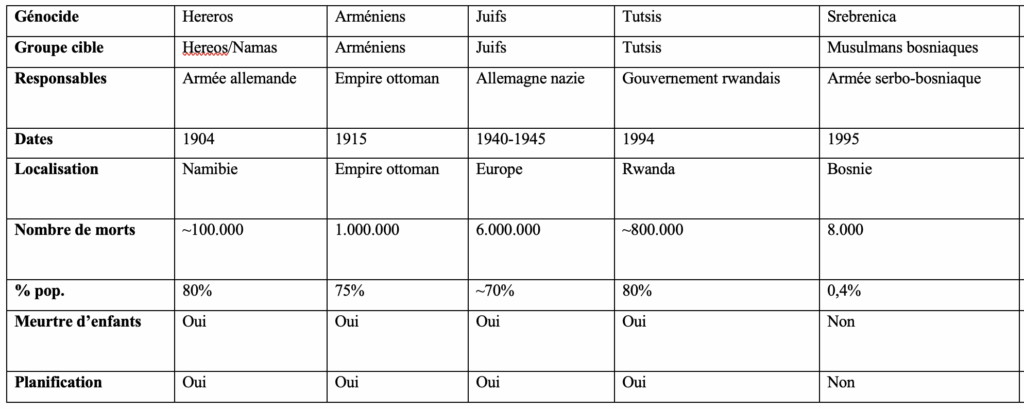 Il y a eu des génocides avant que le mot ait été inventé. Le premier génocide documenté a été celui des Hereros et Namas en Südwestafrika (actuelle Namibie) par l’armée allemande en 1904. Il y a eu ensuite l’extermination des Arméniens par le gouvernement Ottoman au cours de la Première guerre mondiale. Lors de la Deuxième guerre mondiale s’est déroulé le génocide des Juifs européens par le Troisième Reich allemand. Après la signature de la Convention de 1948 on a assisté au génocide des Tutsis, organisé par le gouvernement rwandais et sanctionné par le Tribunal pénal international pour le Rwanda. Lors de ces quatre génocides, identifiés par le nom du peuple victime, il y a eu réelle disparition physique d’un grand nombre (et d’un pourcentage très important) des membres des 4 groupes clairement identifiés : les membres des peuples Herero et Nama (des ethnies) en Namibie avec 80% de mortalité; les Arméniens (de religion chrétienne) dans l’Empire ottoman avec 75% de mortalité ; les Juifs (de religion juive ou d’ethnie juive ou de nationalité juive ou de race juive selon le discours nazi) dans l’Europe contrôlée par l’Allemagne nazie avec près de 70% de mortalité et les Tutsis (ethnie) au Rwanda avec 80% de mortalité. Dans tous les cas il s’est agi de meurtres, dans trois cas combinés avec des conditions de vie devant conduire à la mort (Hereros et Namas laissés dans le désert sans eau ni nourriture ; Arméniens obligés de marcher des milliers de kilomètres dans des conditions inhumaines ; Juifs parqués dans des ghettos avec des rations de misère conduisant à la mort par inanition).