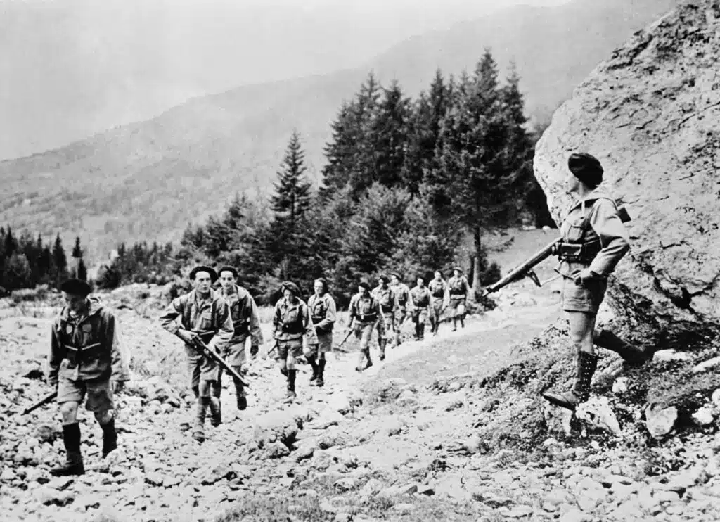 A group of French Resistance guerrilla fighters (maquisards), members of Free France and its Free French Forces (France Libre and Forces françaises libres) cross the Alpes in October 1944. AFP PHOTO
