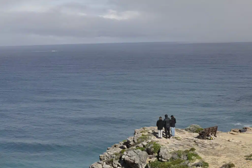Djalil Narjissi (C) and Valerie Narjissi (L), the father and mother of Medhi Narjissi, and another family member observes a moment of silence during a memorial service at Dias Beach at the Cape of Good Hope, near Cape Town, on August 7, 2025. One year after Medhi Narjissi's disappearance at sea, the young French rugby player's family is still left with unanswered questions. On Dias Beach, near the Cape of Good Hope, the 17-year-old participated in a recovery session on August 7, 2024, with his U18 teammates, who had come to compete in the International Series, a competition that took place that year from August 4 to 20. He was swept away by the waves, trapped by the currents of this notoriously dangerous beach. His body has not been found. GIANLUIGI GUERCIA / AFP