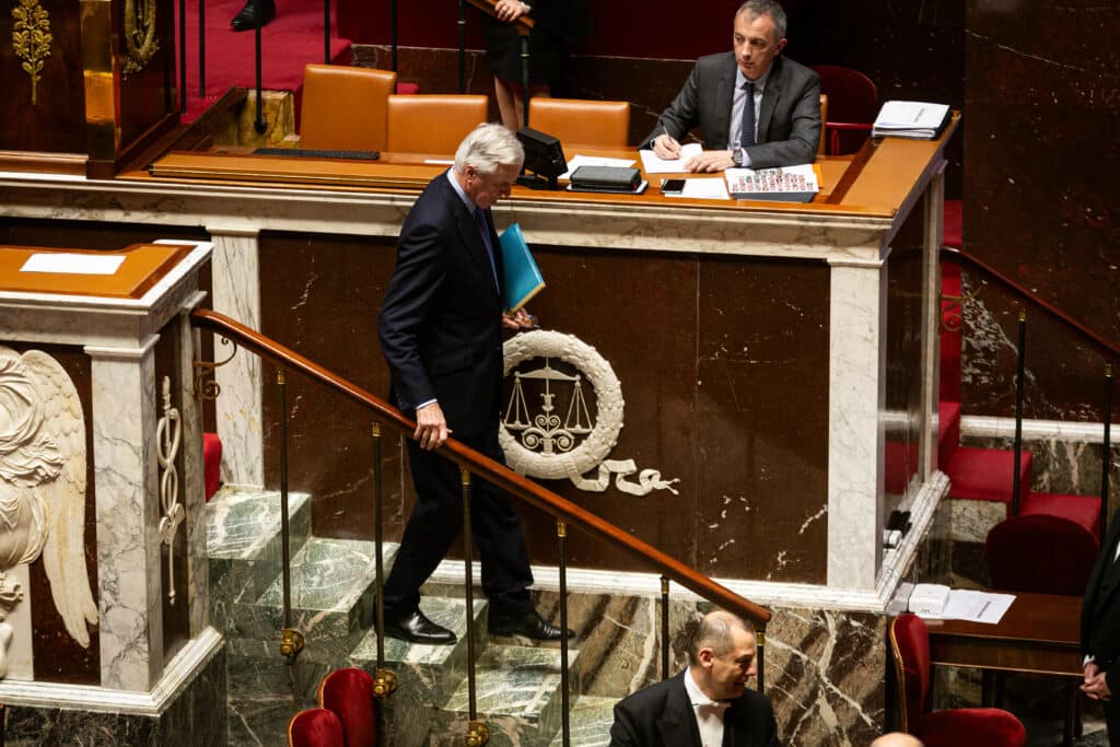 (Photo Belgaimage) : Michel Barnier descend de la tribune à l’Assemblée nationale, 4 décembre 2024)