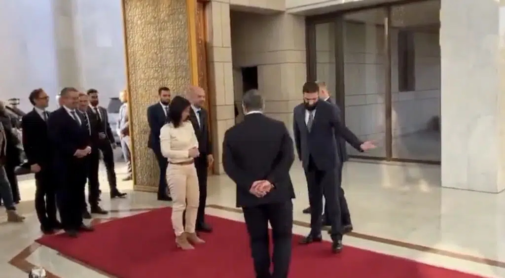 La ministre allemande des Affaires étrangères a toutefois eu la surprise de se voir refuser le « serre-main » par Ahmed al-Charaa. Ce dernier se plie ainsi à une vision rigoriste de l’islam défendue par sa coalition, qui voit comme « illicite » le fait de serrer la main à une femme. Cette façon de se positionner face aux femmes est chose courante dans la région.