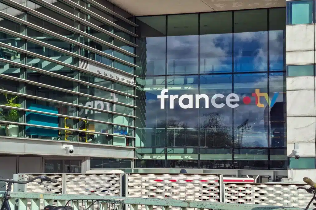 Glass facade of a building at the headquarters of France Televisions in Paris, with the france.tv logo clearly visible on the surface in Paris, France, on February 17, 2026. Facade vitree d un batiment du siege de France Televisions a Paris, avec le logo france.tv visible en grand sur la surface a Paris, France, le 17 fevrier 2026.
