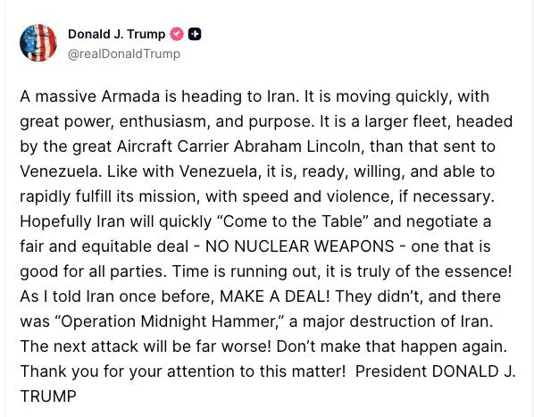 Donald Trump a adressé mercredi un avertissement particulièrement explicite à l’Iran, affirmant que « le temps est compté » pour parvenir à un accord destiné à éviter une intervention militaire américaine. Dans un message publié sur son réseau Truth Social, le président américain a déclaré qu’une « massive armada » de navires de guerre était en route vers la région, prête à agir « avec rapidité et violence si nécessaire ».