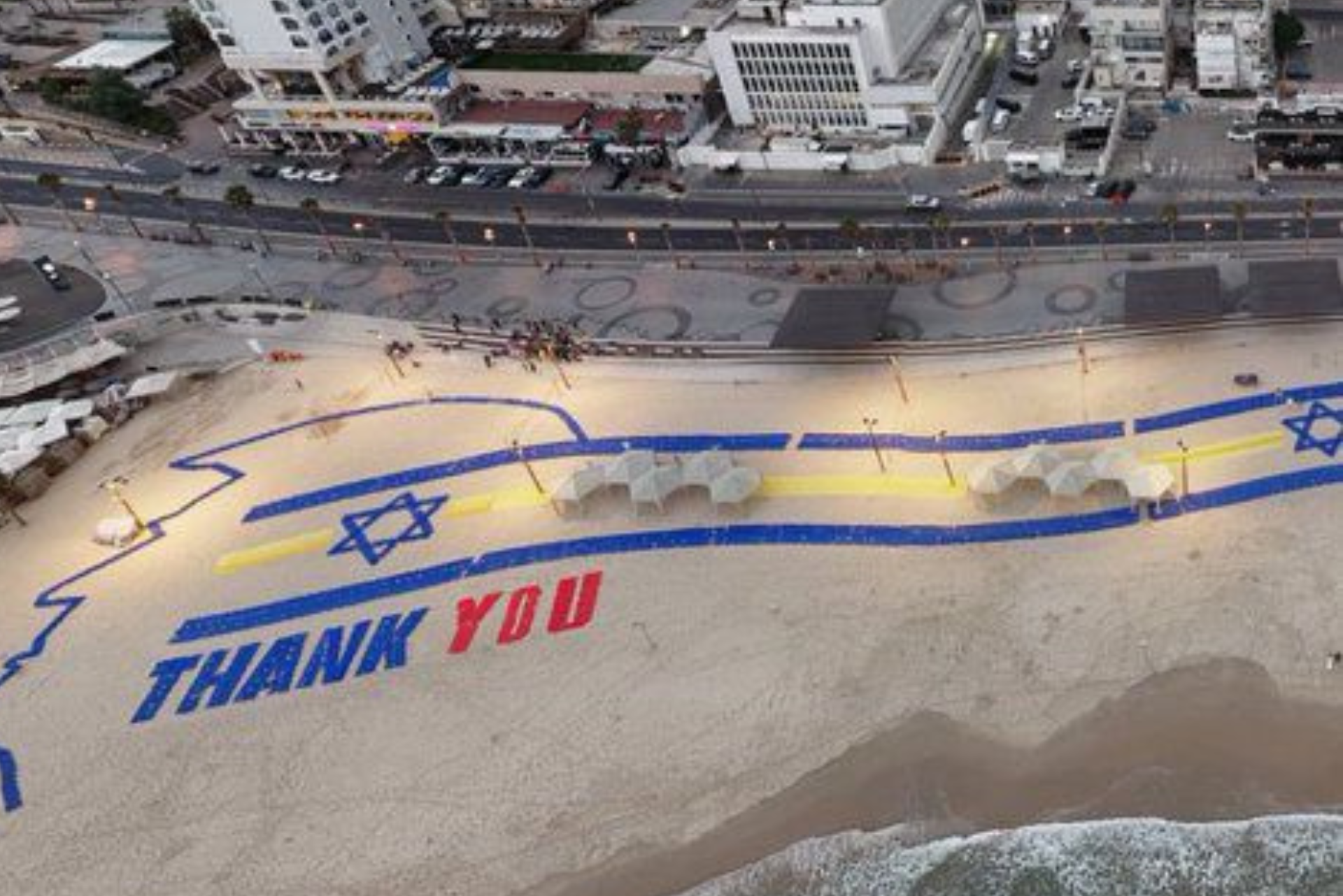 (Photo Saul Loeb / AFP : un grand « Thank you » aux couleurs américaines est déployé sur la plage de Tel Aviv, à l’arrivée de l’avion présidentiel Air Force One, 13 octobre 2025)