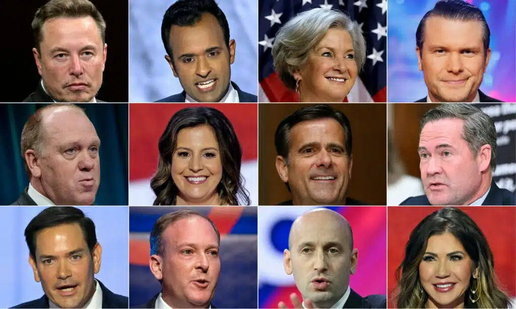 (COMBO) This combination of pictures created on November 12, 2024 shows (From top L), SpaceX, Twitter and electric car maker Tesla CEO Elon Musk looks on as he speaks during his visit at the Vivatech technology startups and innovation fair at the Porte de Versailles exhibition center in Paris, on June 16, 2023, US entrepreneur and former Republican presidential hopeful Vivek Ramaswamy speaks during the second day of the 2024 Republican National Convention at the Fiserv Forum in Milwaukee, Wisconsin, July 16, 2024, Susie Wiles, senior advisor to Republican presidential nominee, former US President Donald Trump's campaign, is recognized for her work during an election night event at the Palm Beach Convention Center on November 6, 2024 in West Palm Beach, Florida, Pete Hegseth attends FOX News All American New Year at Wildhorse Saloon on December 31, 2021 in Nashville, Tennessee, (From center L) US Immigration and Customs Enforcement (ICE) Acting Director Thomas Homan speaks during a press conference, January 31, 2017 in Washington, DC, House Republican Conference Chair Rep. Elise Stefanik (R-NY) speaks on stage on the second day of the Republican National Convention at the Fiserv Forum on July 16, 2024 in Milwaukee, Wisconsin, Representative John Ratcliffe, R-Texas, testifies before a Senate Intelligence Committee nomination hearing on Capitol Hill in Washington, May 5, 2020, US Representative Mike Waltz, Republican of Florida, speaks during a hearing of the House Task Force on the Attempted Assassination of Donald Trump in Butler, Pennsylvania, on Capitol Hill in Washington, DC, September 26, 2024, (From bottom L) US Senator Marco Rubio, Republican of Florida, speaks during the second day of the 2024 Republican National Convention at the Fiserv Forum in Milwaukee, Wisconsin, July 16, 2024, Congressman Lee Zeldin, Republican candidate for governor of New York, speaks onstage during his election watch party in New York City on November 8, 2022, Political advisor Steph
