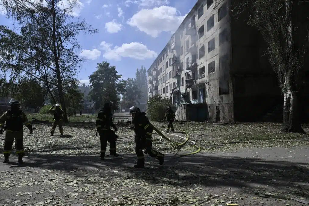Ukrainian firefigters extinguish fire in a residential building at the site of a Russian drone strike in the town of Bilozerske, Donetsk region on August 10, 2025, amid the Russian invasion of Ukraine. Genya SAVILOV / AFP