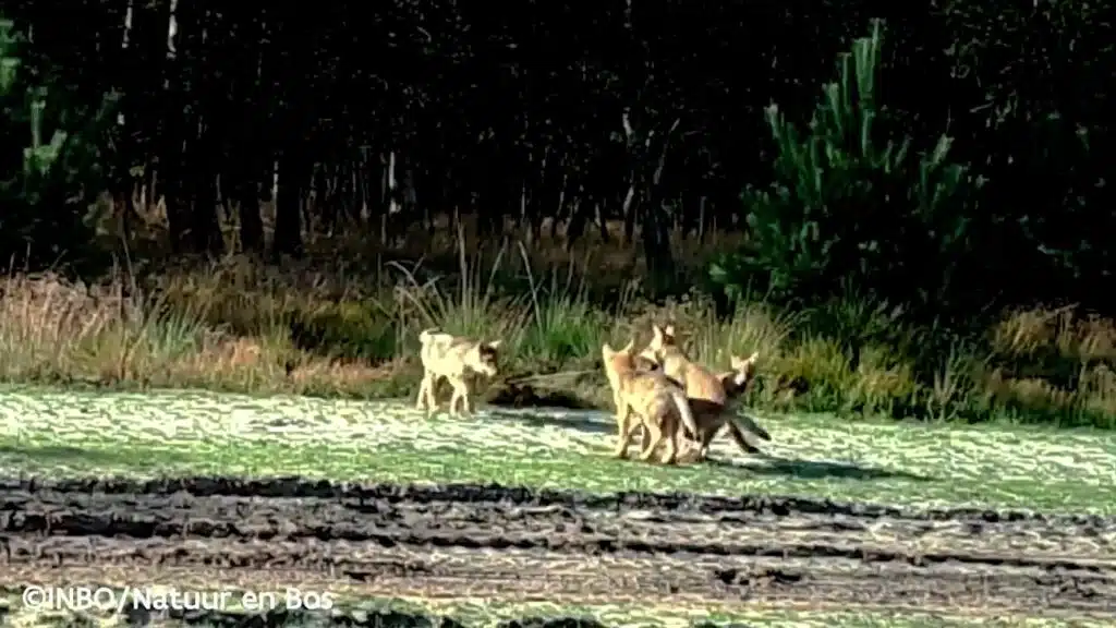 ATTENTION EDITORS - HAND OUT PICTURES - EDITORIAL USE ONLY - MANDATORY CREDIT ANB - INBO Hand out pictures taken on 30 July 2020 by the unmanned camera network and released on , by Agentschap Natuur en Bos ANB and INBO Instituut voor Natuur en Bosonderzoek, shows the four wolf cubs named 'Bosland Daltons' , the first litter of wolves Noella and August, in Limburg province. The images were taken with an unmanned wildlife camera. HAND OUT HAND OUT ANB - INBO