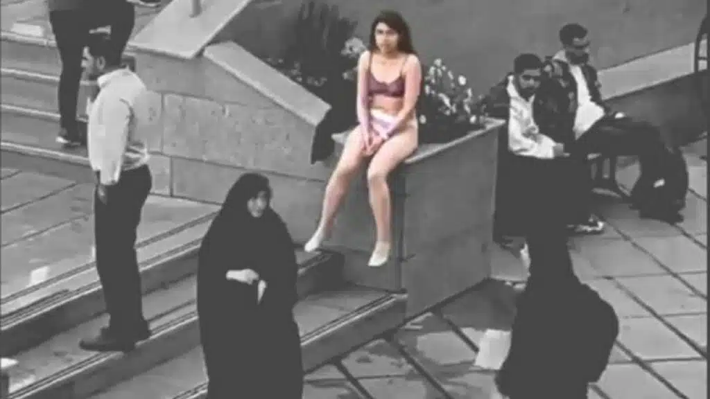 La vidéo fait le tour de X et est corroborée par plusieurs sources, dont le groupe Telegram « Newsletter Amir Kabir » et twittée par le spécialiste du Moyen-Orient Armin Arefi (Le Point). On y voit une jeune étudiante iranienne en sous-vêtement en pleine rue non loin de l’université Azad pour non-port du voile obligatoire.