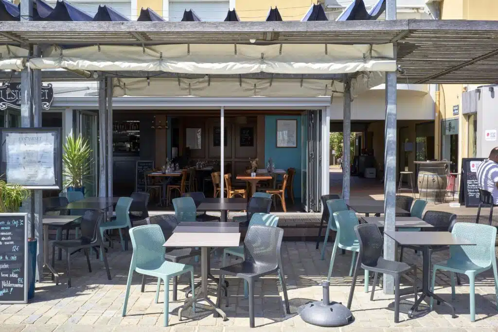 France, Les Sables d Olonne, 2025-08-09. Empty terrace of a downtown restaurant on the seafront. Summer illustration, summer vacations and shopkeepers. Photography by Mathieu Thomasset / Hans Lucas. France, Les Sables d Olonne, 2025-08-09. Terrasse vide d’un restaurant en centre-ville sur le front de mer. Illustration ete, vacances estivales et commercants. Photographie de Mathieu Thomasset / Hans Lucas.